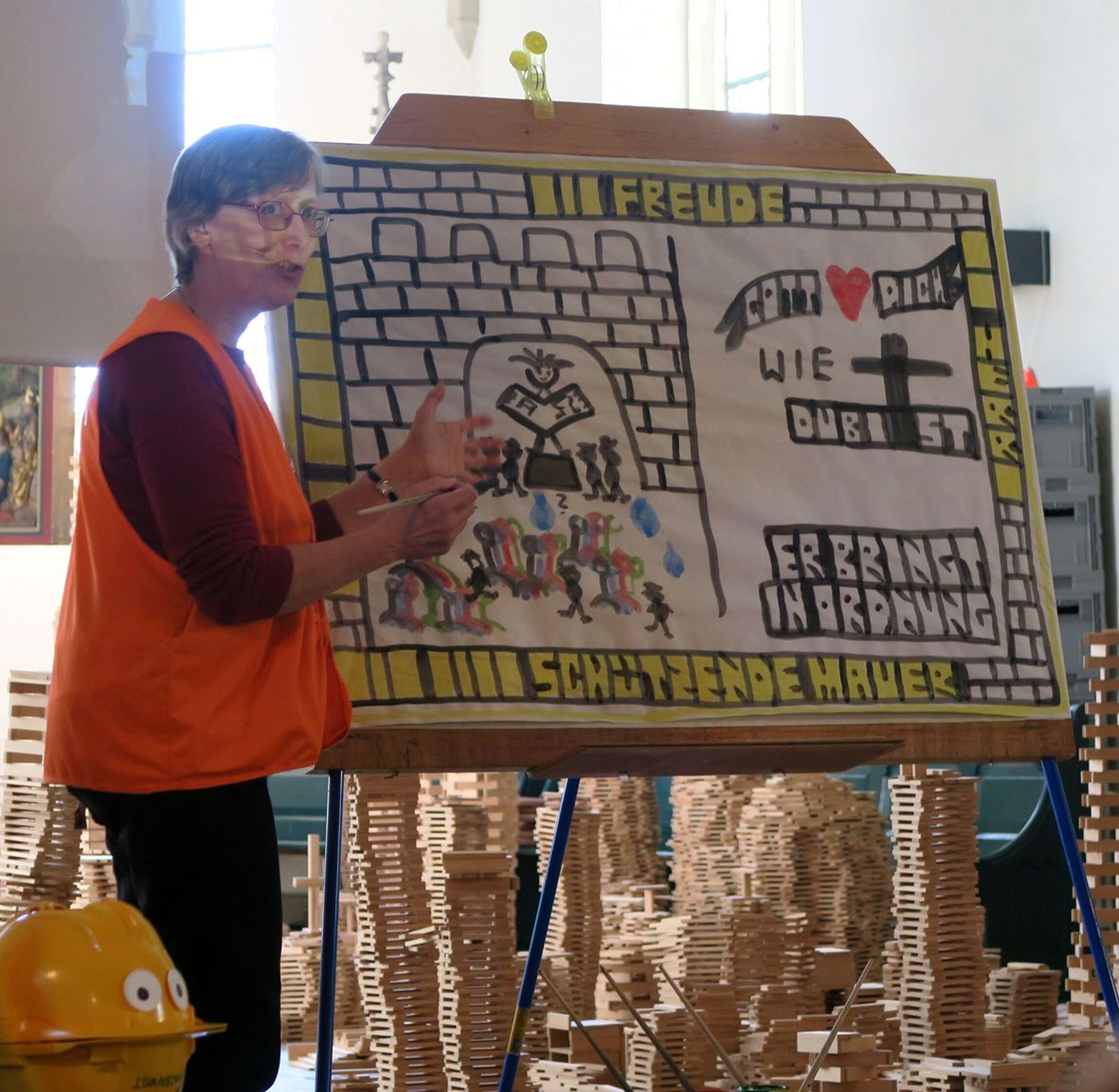 So langsam wird es ein wenig unruhig in den Bänken, wissen doch alle, dass Ruth mit einem Kleintransporter und 90 Kisten voller Holzbausteine angereist ist. Diese Kisten mit insgesamt 60.000 Bausteinen stehen nun verteilt in der Kirche und im Altarraum, der heute ganz anders aussieht: Extra für die Baustelle sind die Bänke, die normalerweise dort stehen, zur Seite geräumt worden. So haben wir viel Platz um Jerusalem und die Stadtmauer, um die es ebenfalls in der Geschichte geht, aufzubauen.