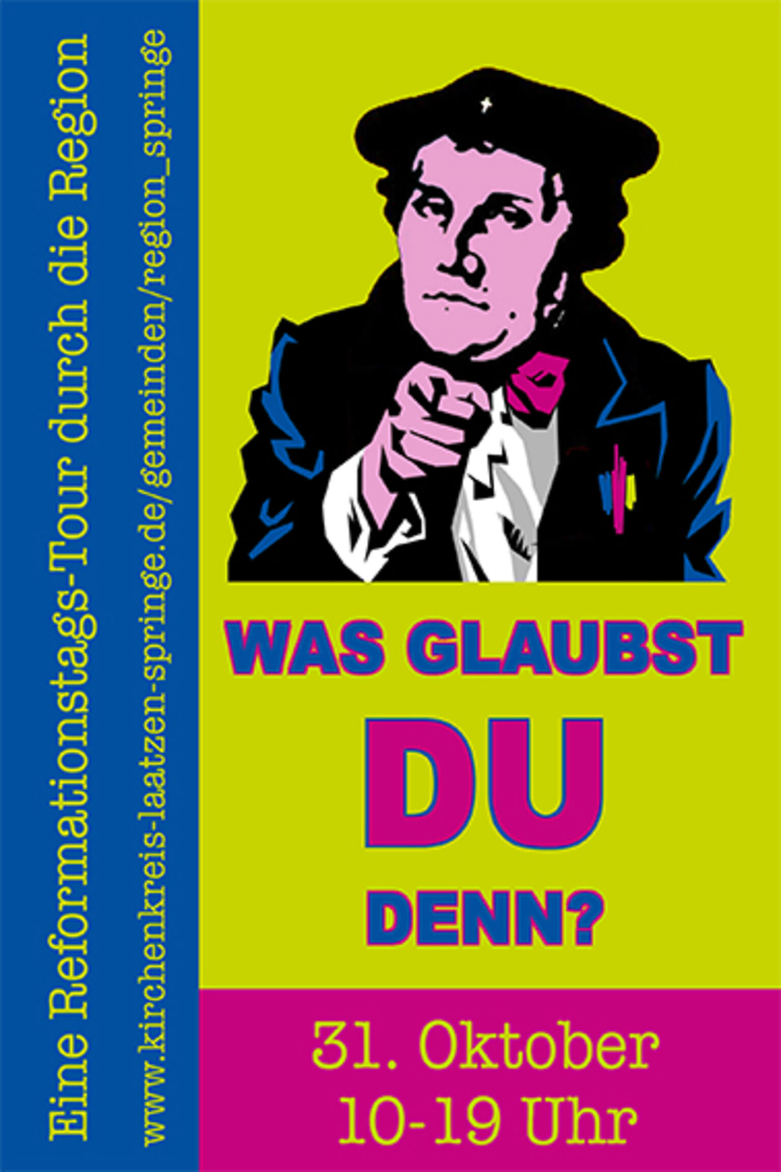 Was glaubst DU ganz persönlich? Und was glaubt der Mensch neben dir? Am Reformationstag (Sonntag, den 31. Oktober) soll sich in diesem Jahr alles um den Glauben drehen. Die Gemeinden der Region laden gemeinsam ein: Mach dich auf den Weg! Pick dir die Rosinen aus dem Programm! Schau, wohin es dich treibt! Triff spannende Menschen aus der Region. Lerne andere Kirchen in der Region kennen. Hab einen spannenden und bereichernden Tag!