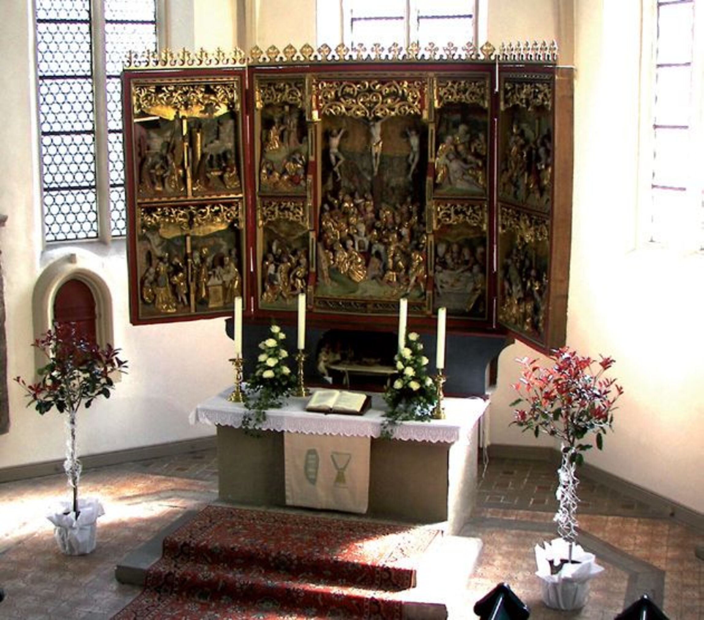 Die Bilder des Marienaltars geben nicht wie Fotogerafien Momentaufnahmen wieder, sondern sie erzählen die Heilsgeschichte. Der Bilder des linken Flügels sind von links nach rechts angeordnet. Er erzählt von der Verkündigung und der Geburt Jesus Christus. Die Krippe ist leer, das Kind liegt in einem Strahlenkranz unbefleckt auf der Erde. Die anderen beiden Bilder stellen die Anbetung der drei Weisen aus dem Morgenland und der Darstellung Jesu im Tempel dar in Anwesenheit von Maria und der Prophetin Hanna sowie Simeon und Josef. Die Frau hinter Maria kann nach dem Lukasevangelium nicht identifiziert werden. Der Bilder des mittleren Teils des Altares sind von oben nach unten angeordnet. Sie erzählen von Jesus in Gethsemane und die Kreuztragung Jesu. Im Mittelpunkt steht die Kreuzigung Jesu mit den drei aufgerichteten Kreuzen. Auffällig ist die Aufteilung der Menschen. Rechts vom Kreuz Jesu befinden sich diejenigen, die vom Wirken und Leiden Jesu berührt und betroffen sind. Auf der linken Seite sind die Leute, die das Geschehen kaum beachten. Es fallen hier die von den Menschen emporgereckten Waffen auf. Das Kreuz Jesu steht genau auf der Mittelachse des Altarraumes. Auf ihr hält an der Decke der Schlussstein mit der Darstellung des Lamm Gottes die gotischen Gewölbestreben zusammen. Die beiden anderen Bilder erzählen von der Kreuzabnahme Jesu durch Josef von Arimathäa und der Grablegung Jesu.