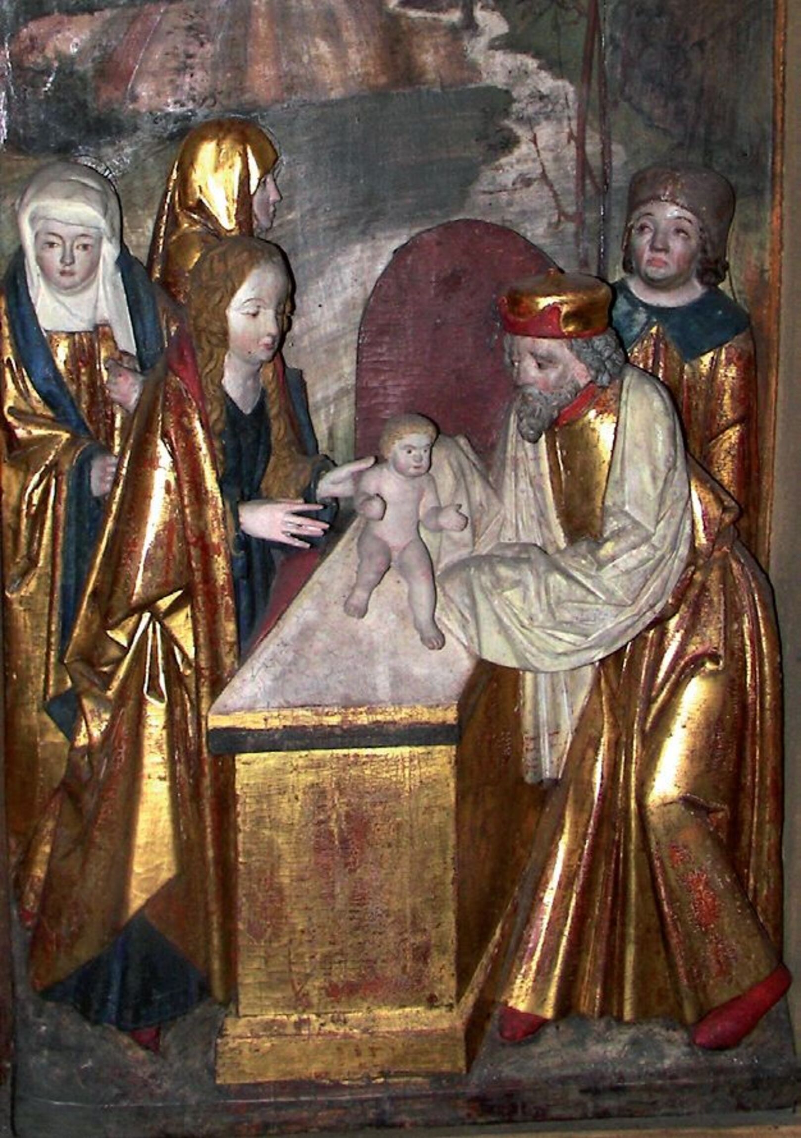 Um 1480 wird der spätgotische Flügelaltar geschaffen. Der Altar hat einen Rahmen aus Eichenholz, die Figuren sind aus Lindenholz geschnitzt. Er zeigt die Stationen des Marienleidens, die in der Leidensgeschichte Jesus eingebettet sind. Der Künstler ist unbekannt. Er könnte sich aber in der Kreuzigungsszene dargestellt haben. Die Figur trägt einen breiten weißen Kragen und unterscheidet sich durch ihr Äußeres von den anderen Figuren.